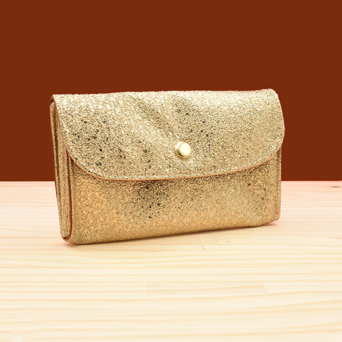 Brillez au quotidien avec notre portefeuille en simili cuir doré. Son design élégant et pratique offre trois compartiments, dont une poche zippée pour vos pièces. Format idéal pour vos billets, cartes et papiers d’identité, il allie style lumineux et fonctionnalité. Fabriqué en France, dans notre atelier.